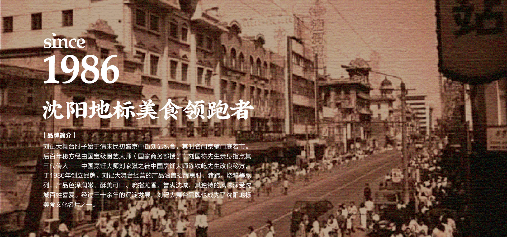 盛京,昔乃大清王朝發(fā)祥之地。劉記大舞臺肘子始于清末民初盛京中街劉記熟食,其時名聞京輔門庭若市。后百年秘方經(jīng)由國寶級廚藝大師(國家商務(wù)部授予)劉國棟先生親身指點其三代傳人——中國烹飪大師劉家驥之徒中國烹飪大師陳鐵屹先生改良秘方,于1986年創(chuàng)立品牌。劉記大舞臺經(jīng)營的產(chǎn)品涵蓋招牌熏肘,豬蹄,燒雞等系列,產(chǎn)品色澤潤嫩、酥美可口、吮指尤香、譽滿沈城,遂成古今絕味,其獨特的風(fēng)味深受沈城百姓喜愛。經(jīng)過三十余年的沉淀發(fā)展,劉記大舞臺品牌也成為了沈陽地標(biāo)美食文化名片之一。